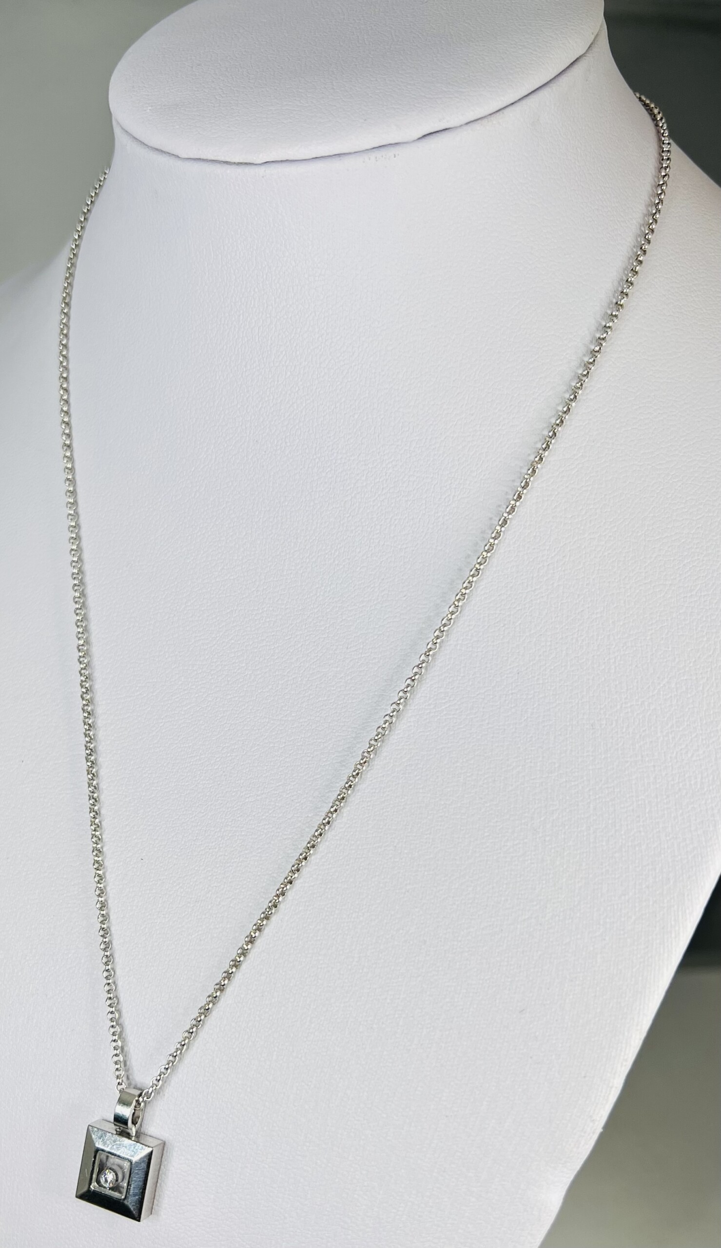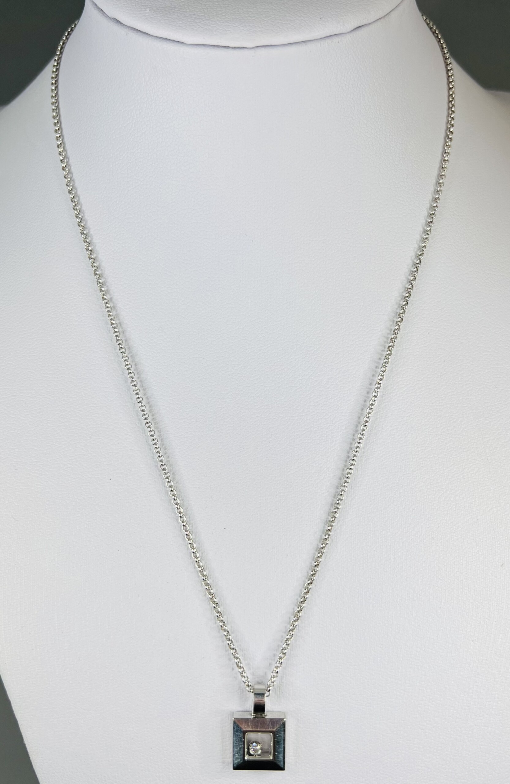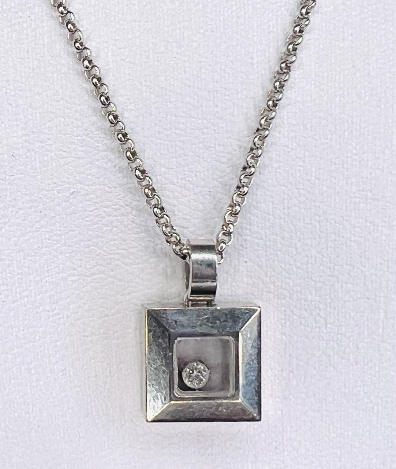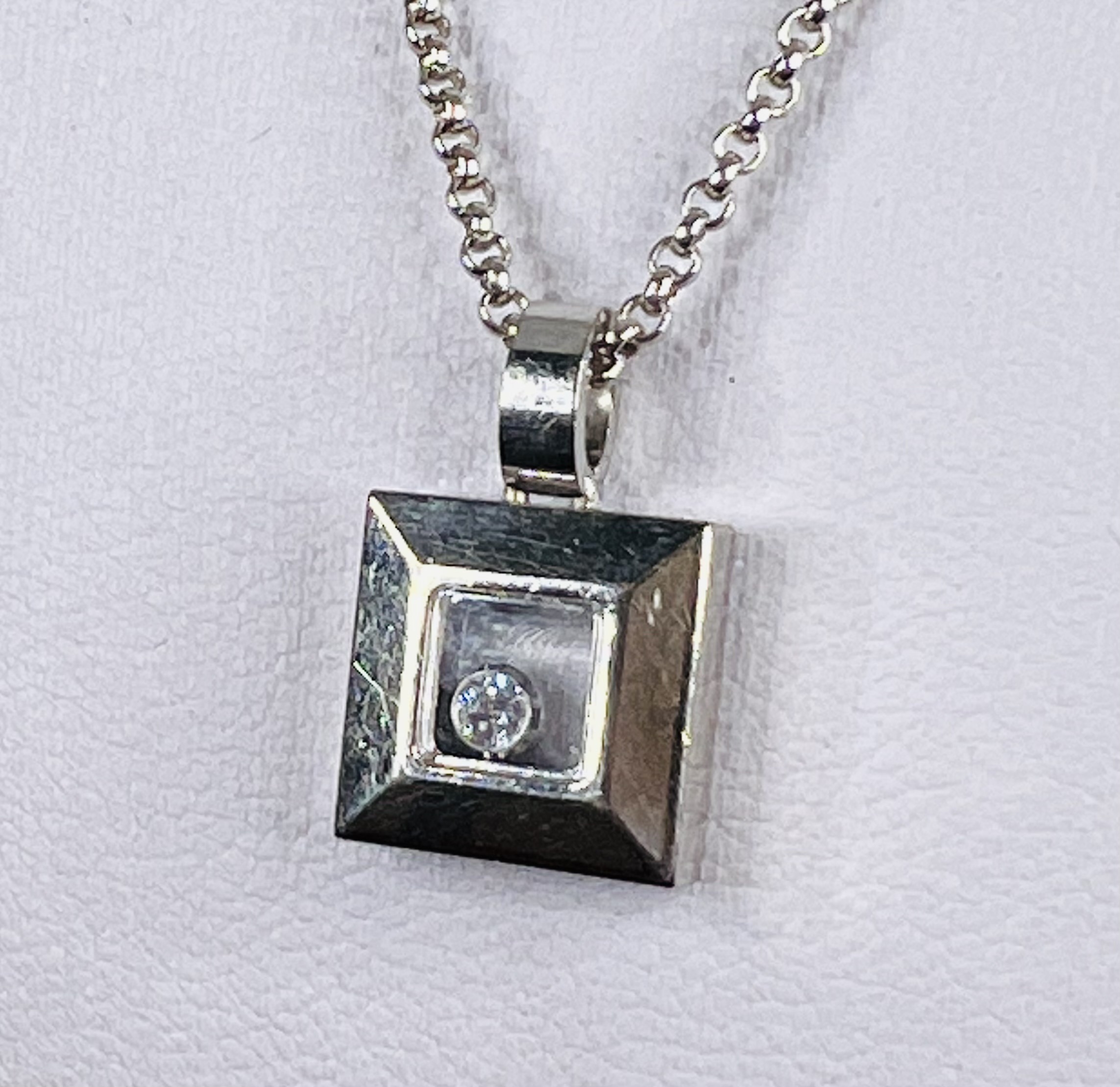 Featuring a square window pendant with a floating 0.05ct brilliant cut diamond, the pendant sparkles elegantly with every movement.