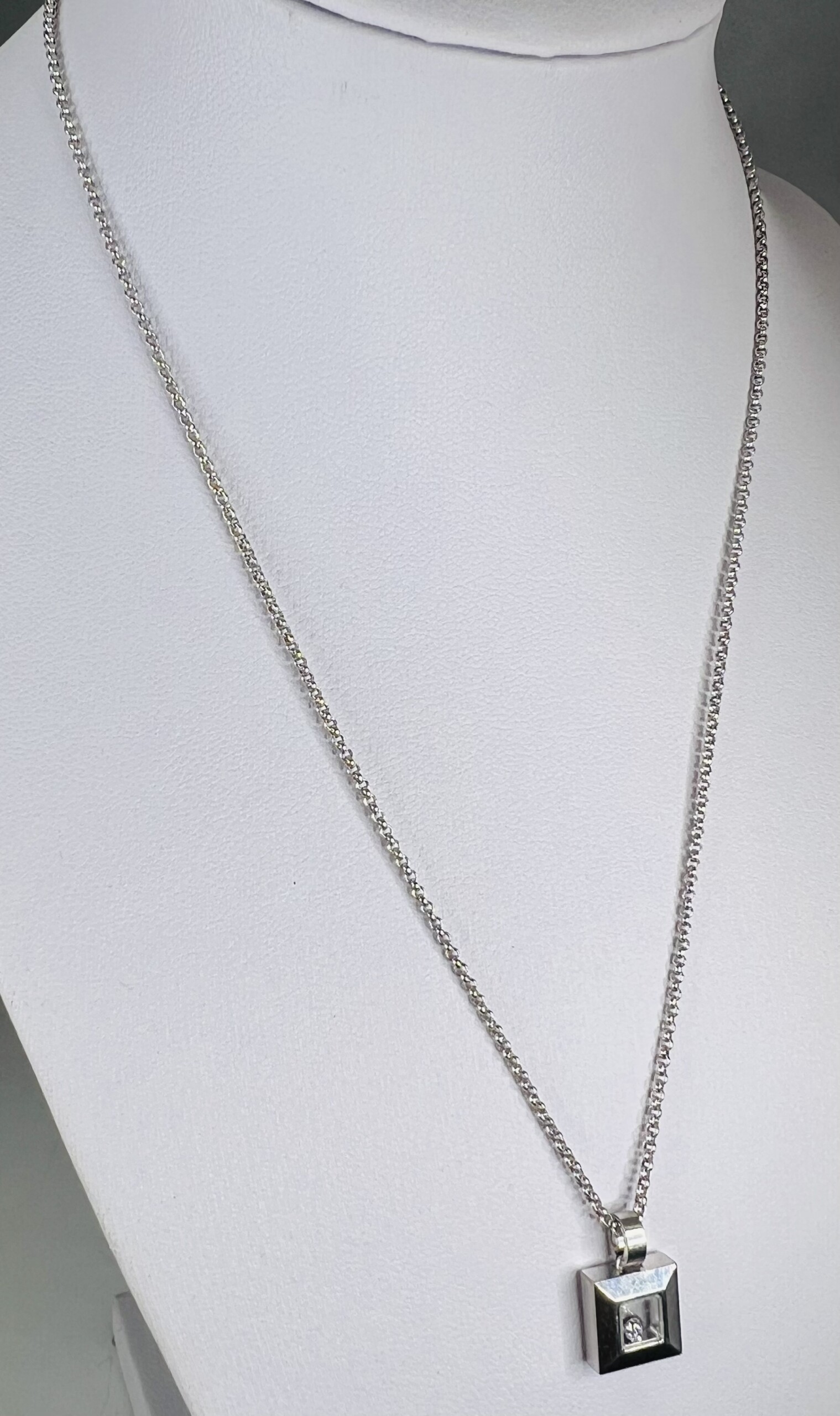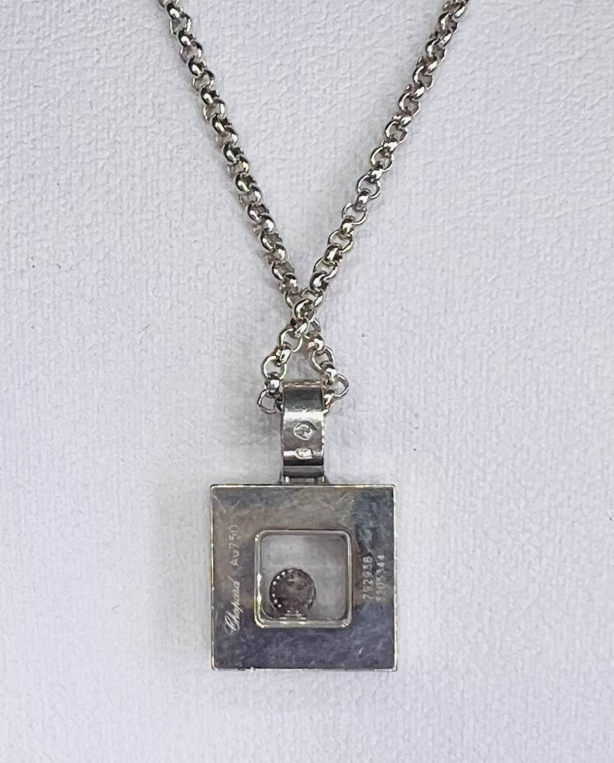 This exquisite second hand Chopard necklace showcases the iconic Happy Diamonds design in 18ct white gold.