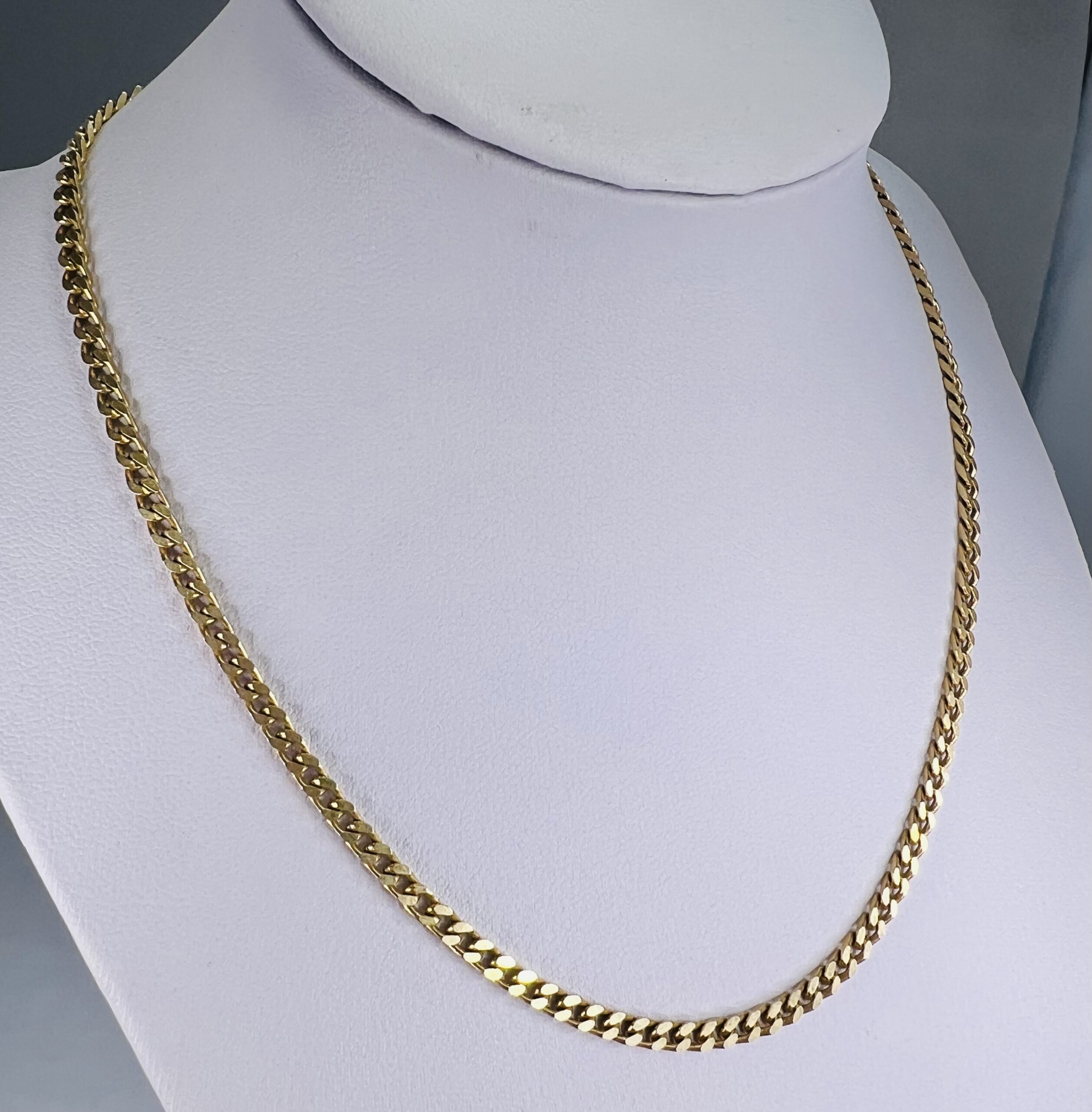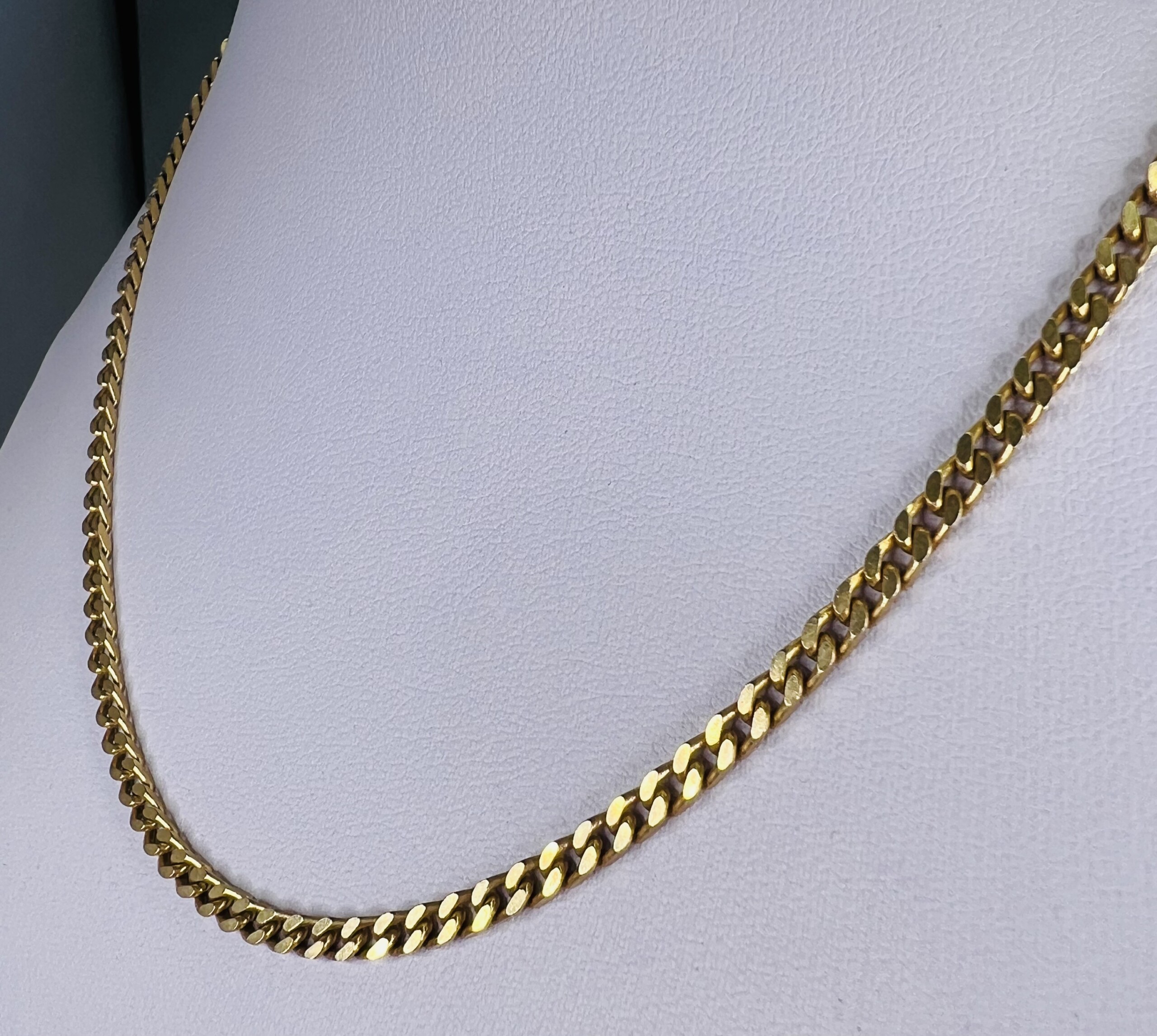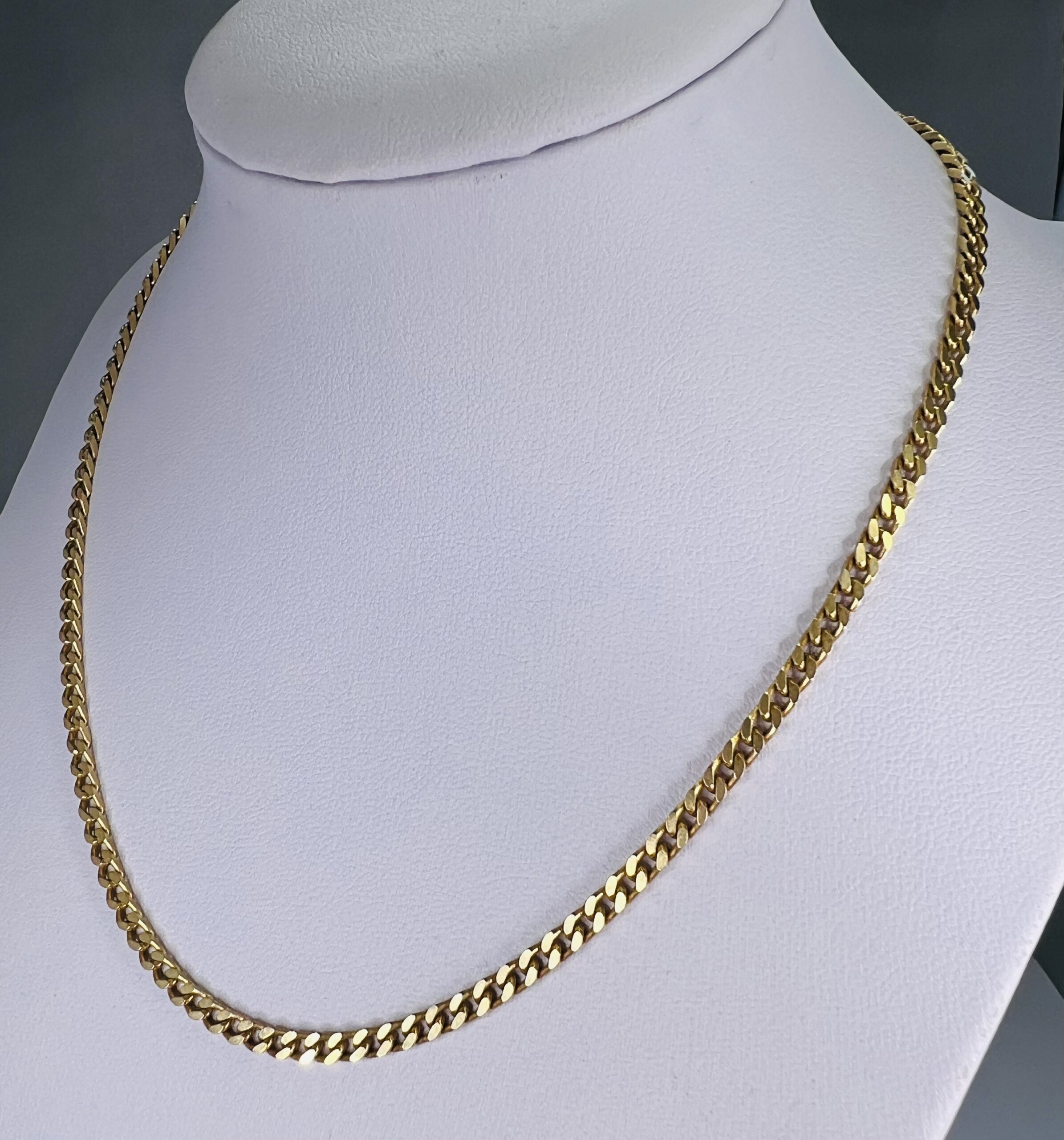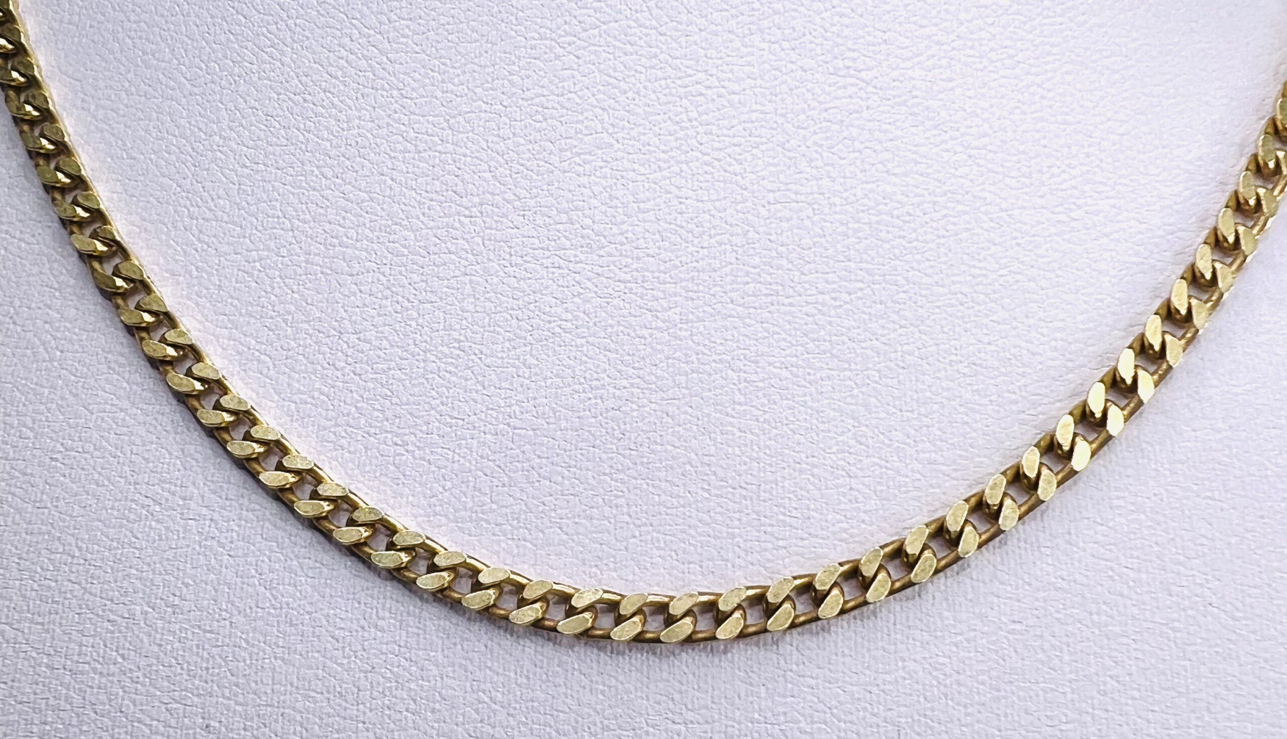 This second hand 9ct yellow gold flat edge curb chain is a bold yet timeless piece, crafted with a sleek polished finish.