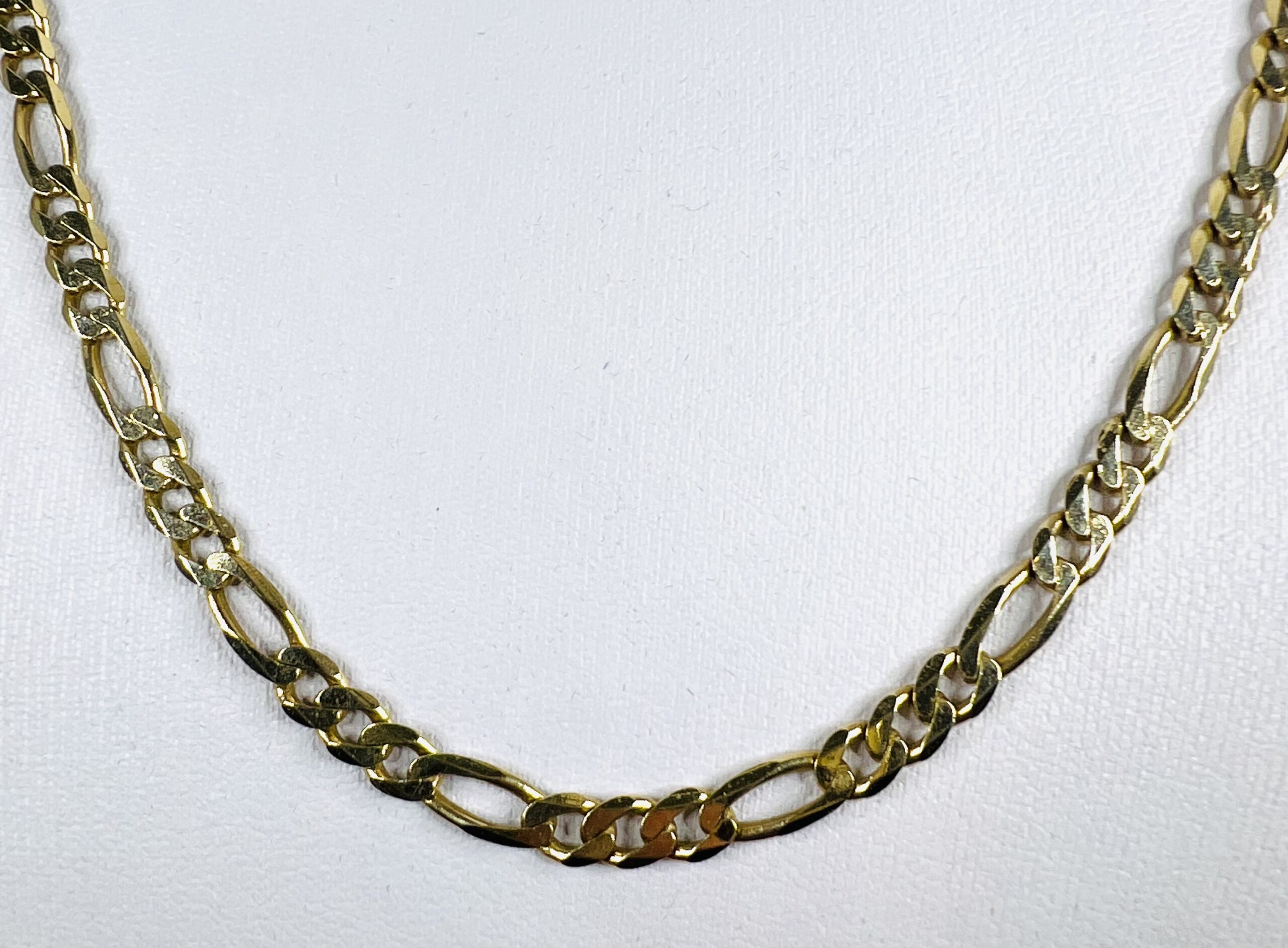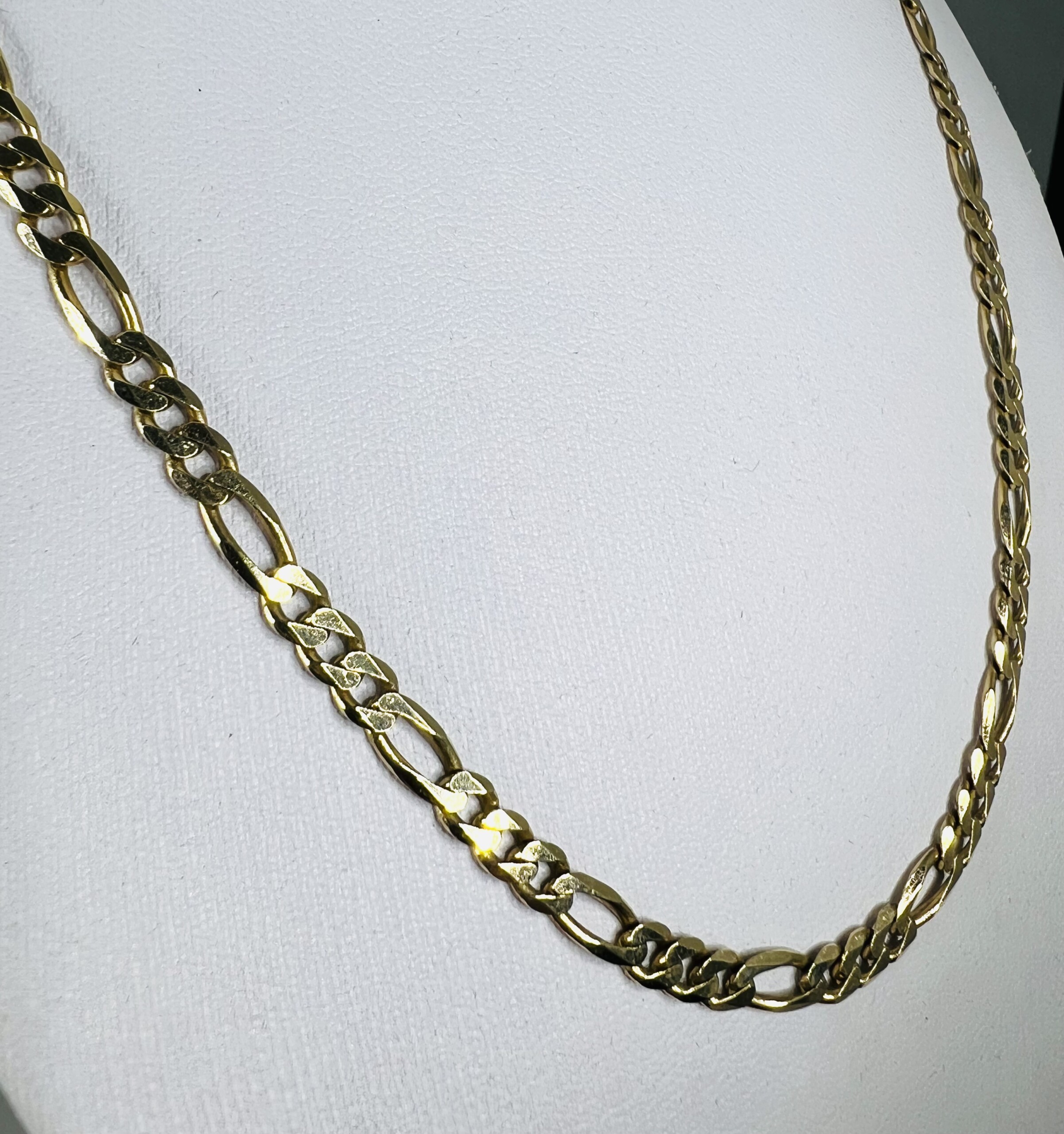 A classic design with enduring appeal, this second hand 9ct yellow gold Figaro chain measures 19 inches in length and 5mm in width.
